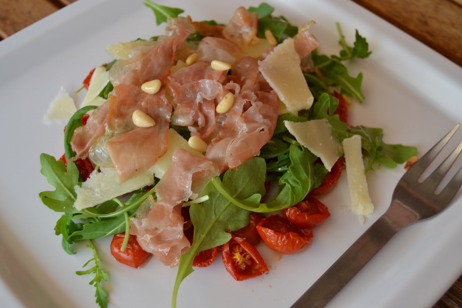 Insalata di pomodorini, prosciutto croccante, grana e pinoli