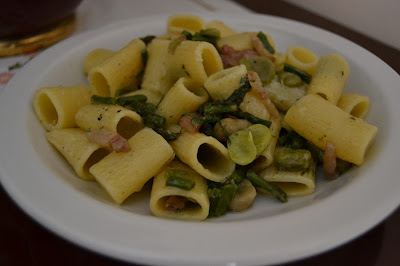 Mezze maniche con asparagi, fave, guanciale e pecorino