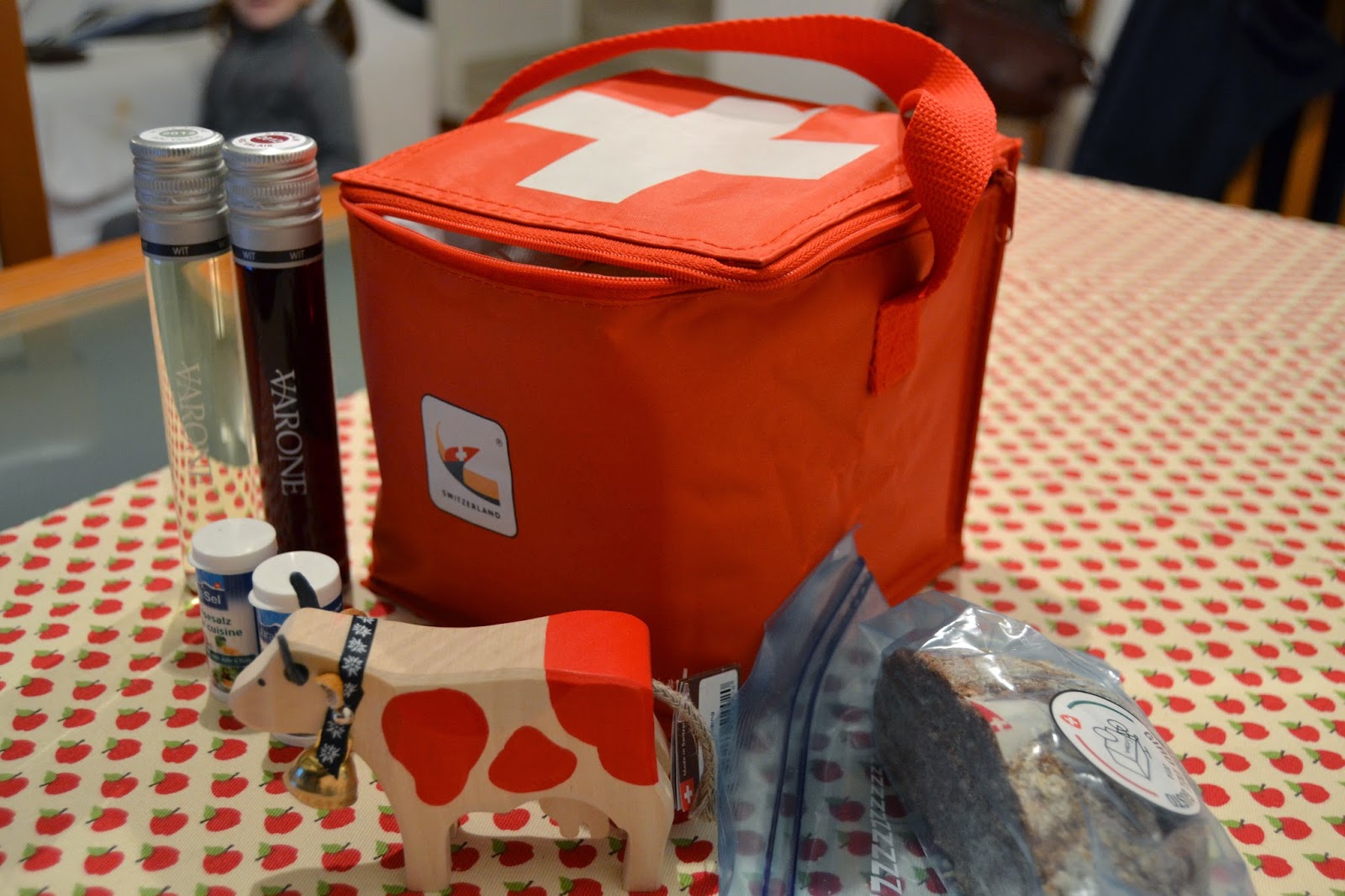 una volta appurato che non fosse il kit del pronto soccorso, aprendola ho scoperto che era piena di prelibatezze gastronomiche svizzere: un’ampia selezione di formaggi, il bratwurst (ovvero la regina delle salsicce), il pane di segale, il sale all’antica raccolto direttamente nel cuore delle Alpi, il saucisson vaudois, due “fiale” di vini svizzeri e per finire, una spiritosa mucca in legno nei colori della Svizzera……ma perché tutto questo ben di Dio? Semplice, per preparare il Giro del Gusto!