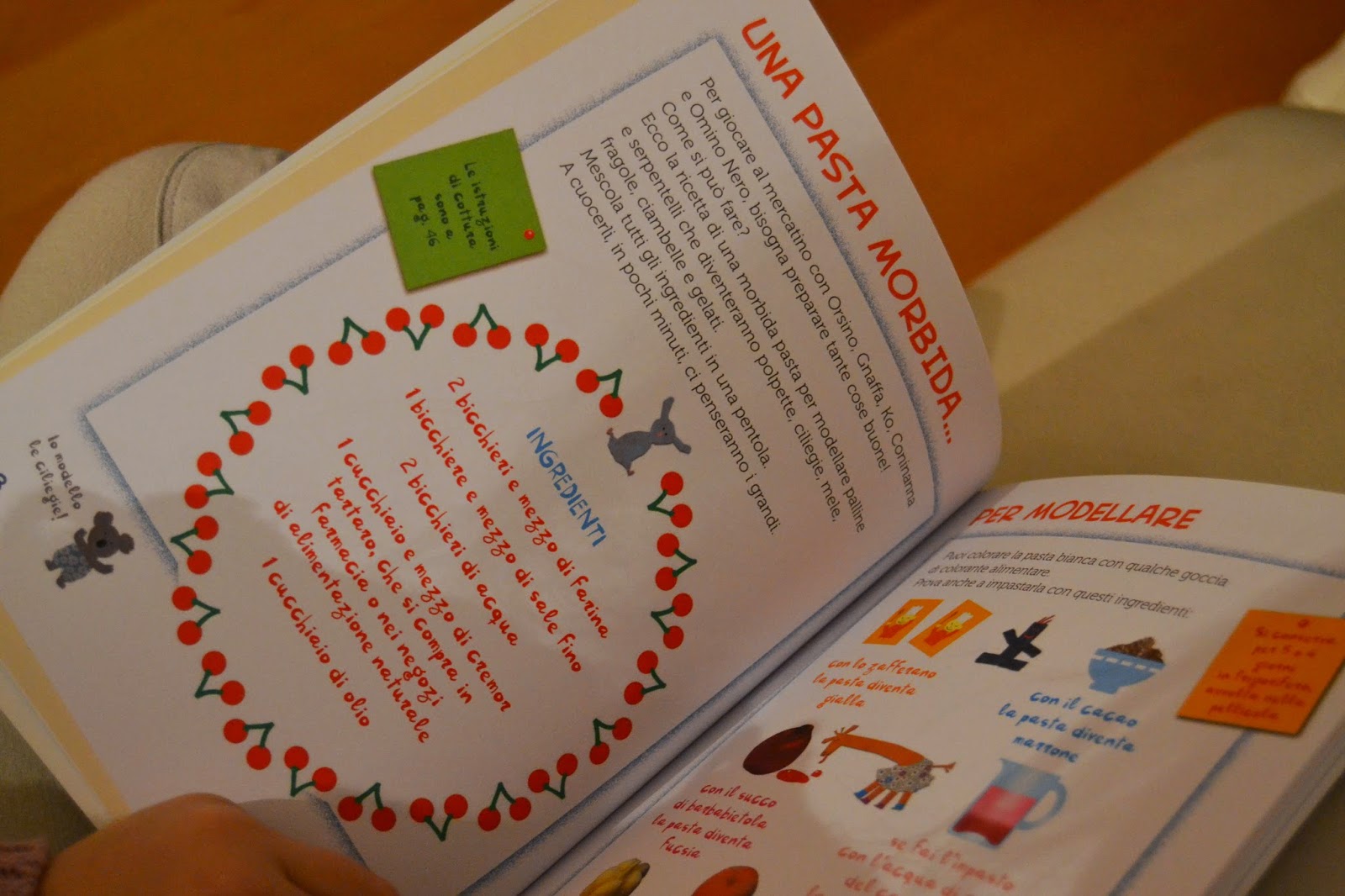 Ho cominciato a sfogliare il libro insieme alla Nanetta ed abbiamo iniziato a giocare a Lei che faceva la spesa: sul libro c’è anche la ricetta della pasta morbida per modellare (andate a vedere il tutorial su come si fa! È semplicissimo), dell’insalata fatta con la carta crespa e si trovano anche le spiegazione su come costruire il mercatino con materiali di riciclo.