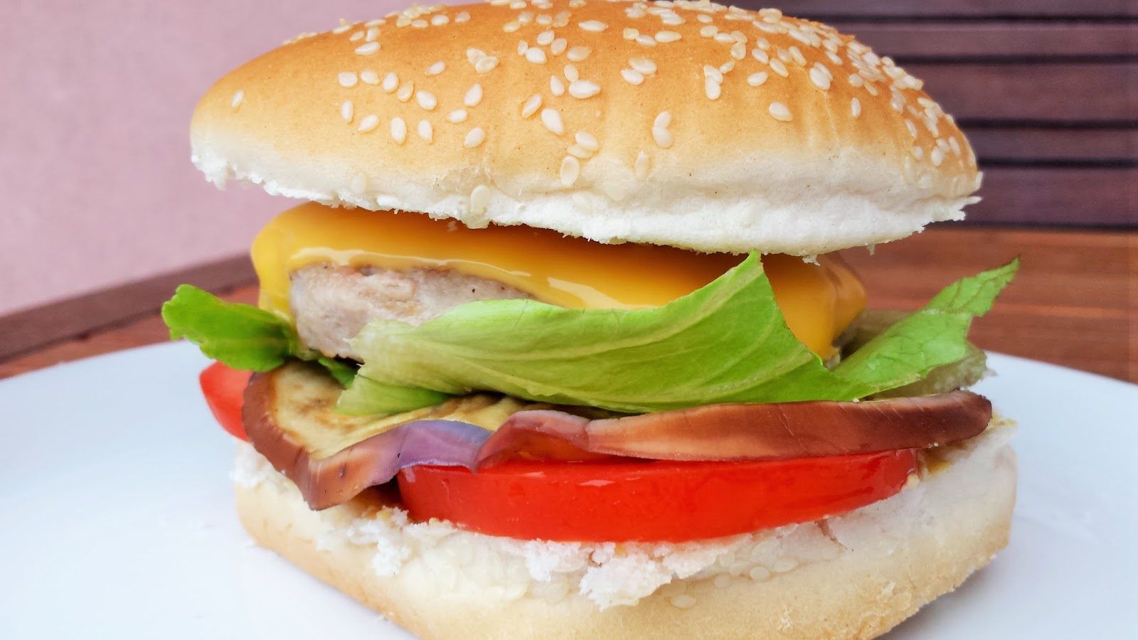 Scaldate leggermente il panino sulla griglia. Cuocete l’hamburger e cominciate l’assemblaggio. Io ho messo dapprima la senape, poi il pomodoro, poi le melanzane, poi l’insalata, il formaggio ed infine l’hamburger…addentate senza esitazione!