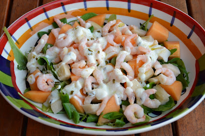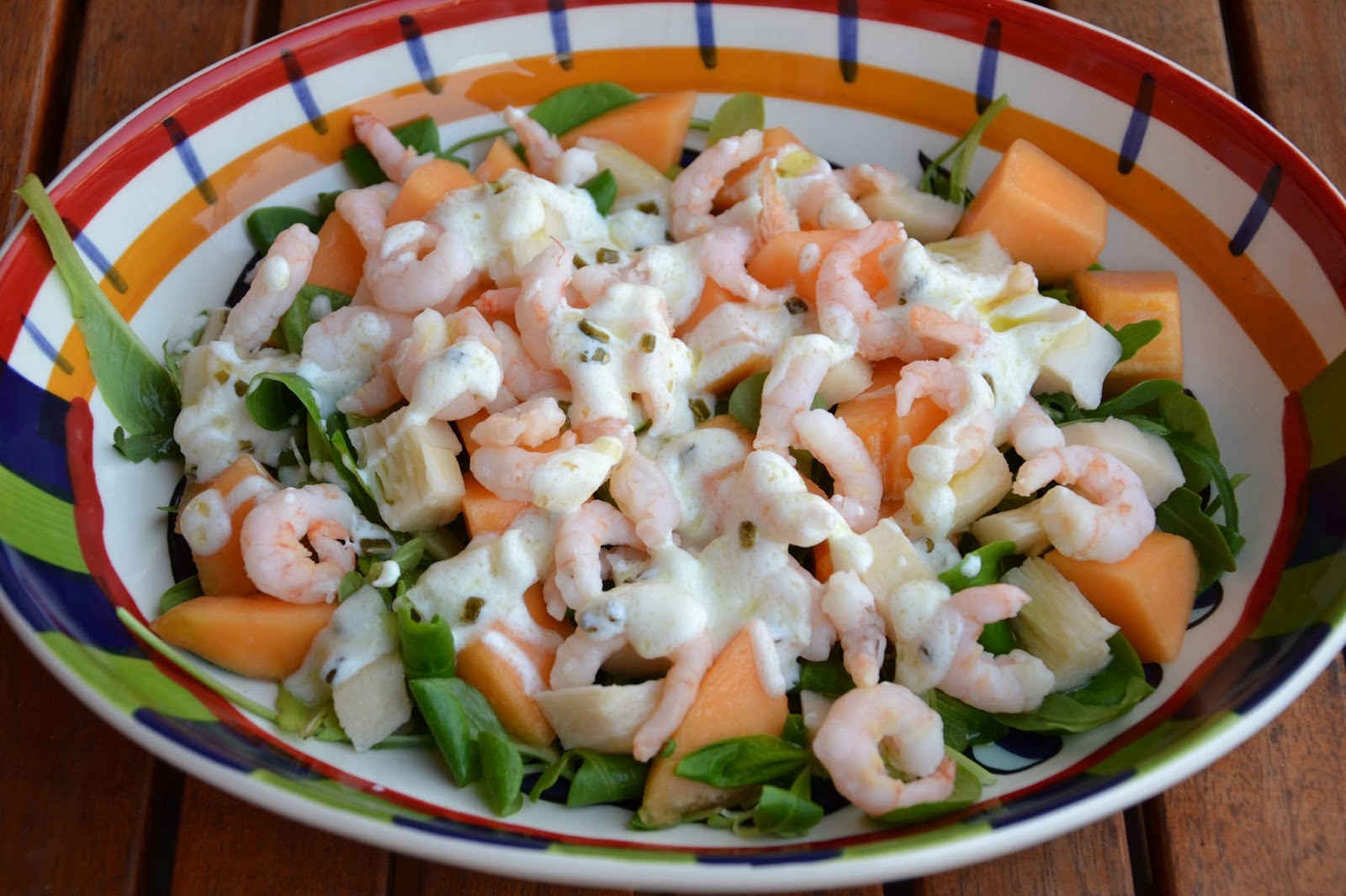 Tagliate a cubetti il melone ed il cuore di palma. Lavate l’insalata. Componete l’insalatona cominciando proprio dall’insalata, continuando con il melone, il palmito ed i gamberetti. In una ciotola mescolate lo yogurt, l’olio evo, l’erba cipollina sminuzzata ed il sale. Versate la salsa sull’insalata, mescolate bene e poi mangiate.